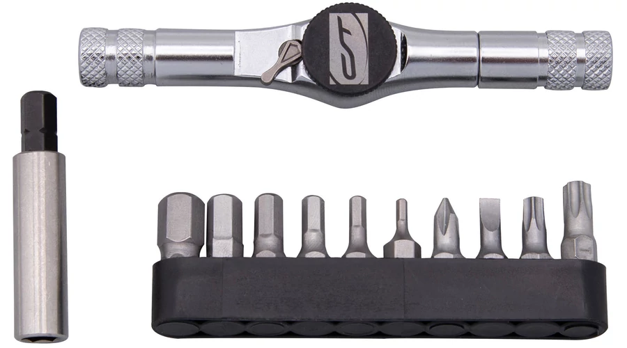 A "TFR Trident Ratchet" egy sokoldalú racsnis bitkészlet. T-kulcsként használható és a racsni mindkét irányban használható. Hosszabbító és táska mellékelve. A króm-vanádium szerszámacélból készült tíz csavarkulcs a következő: 2,5; 3; 4; 5; 6 és 8 mm-es imbuszkulcsok; T25 és T30 Torx kulcsok és PH1 Phillips csavarhúzó.