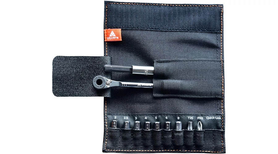 Racsnis hajtókaros zsebszerszám összehajtható szövet tokban.