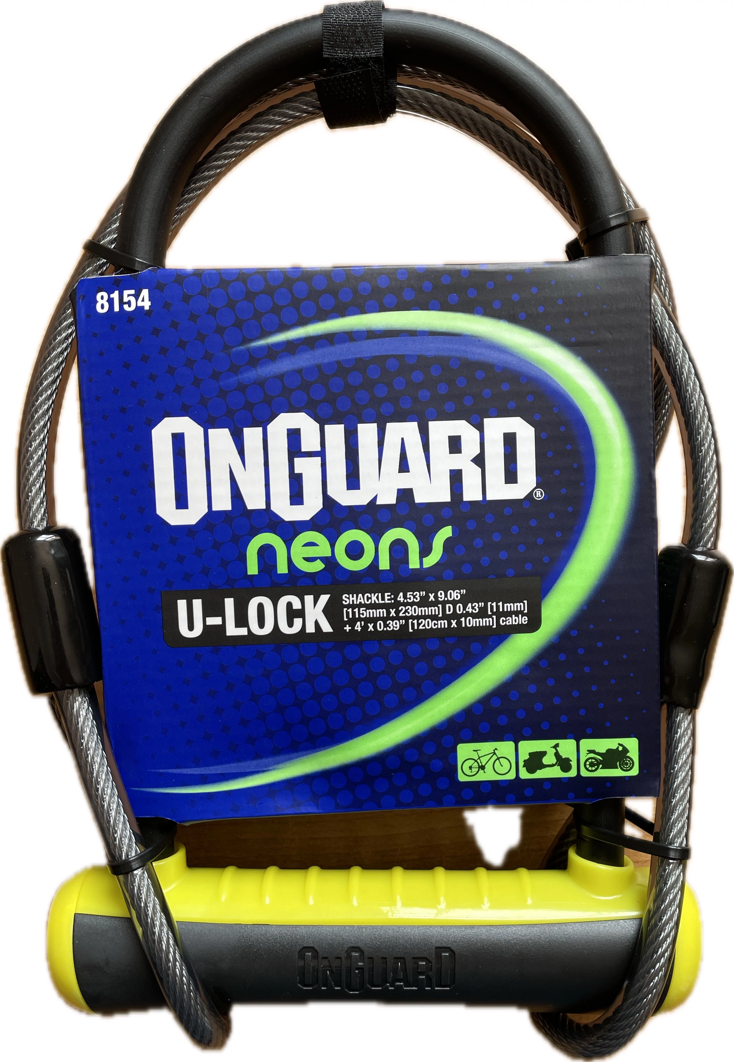 Neon sorozat 8154-es modell. Sárga 115 mm széles, 230 mm magas, 11 mm vastag U-lakat 120 mm hosszú kábellel, 2 kulccsal, vázra szerelhető konzollal.Lakat Onguard Neon U-lakat Sárga 115 x 230 x 11 mm 120 mm kábel 8154S