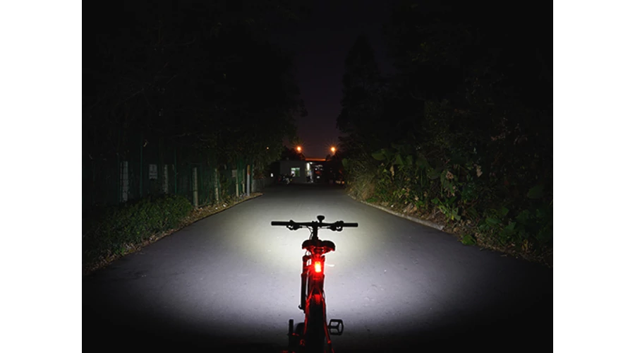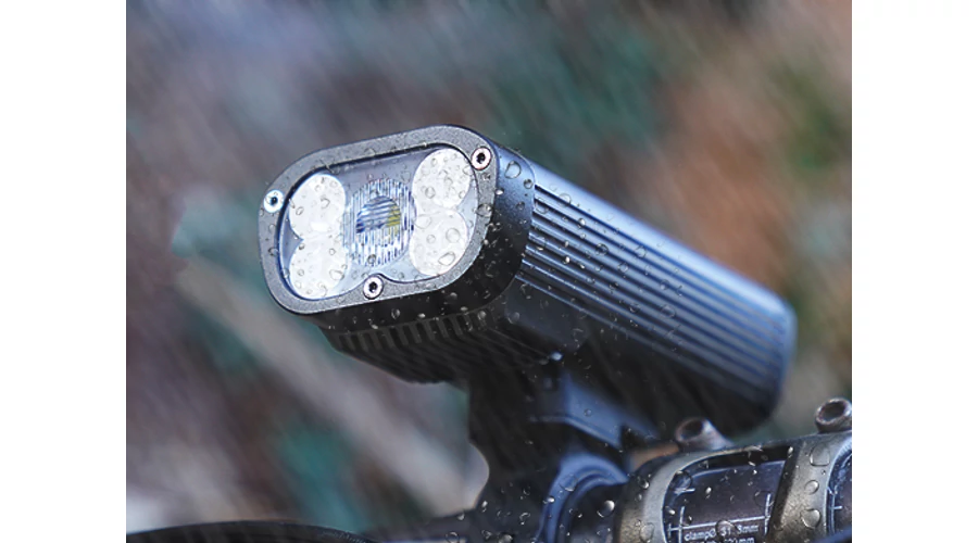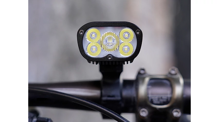 HiLo fényszórórendszer hegyi kerékpározáshoz, amely az autóipari fényszóró kialakításának szimulációja, azaz nagy hatótávolságú távolsági fénysugárral és széles tompított fénysugárral rendelkezik a terepes kalandokhoz.